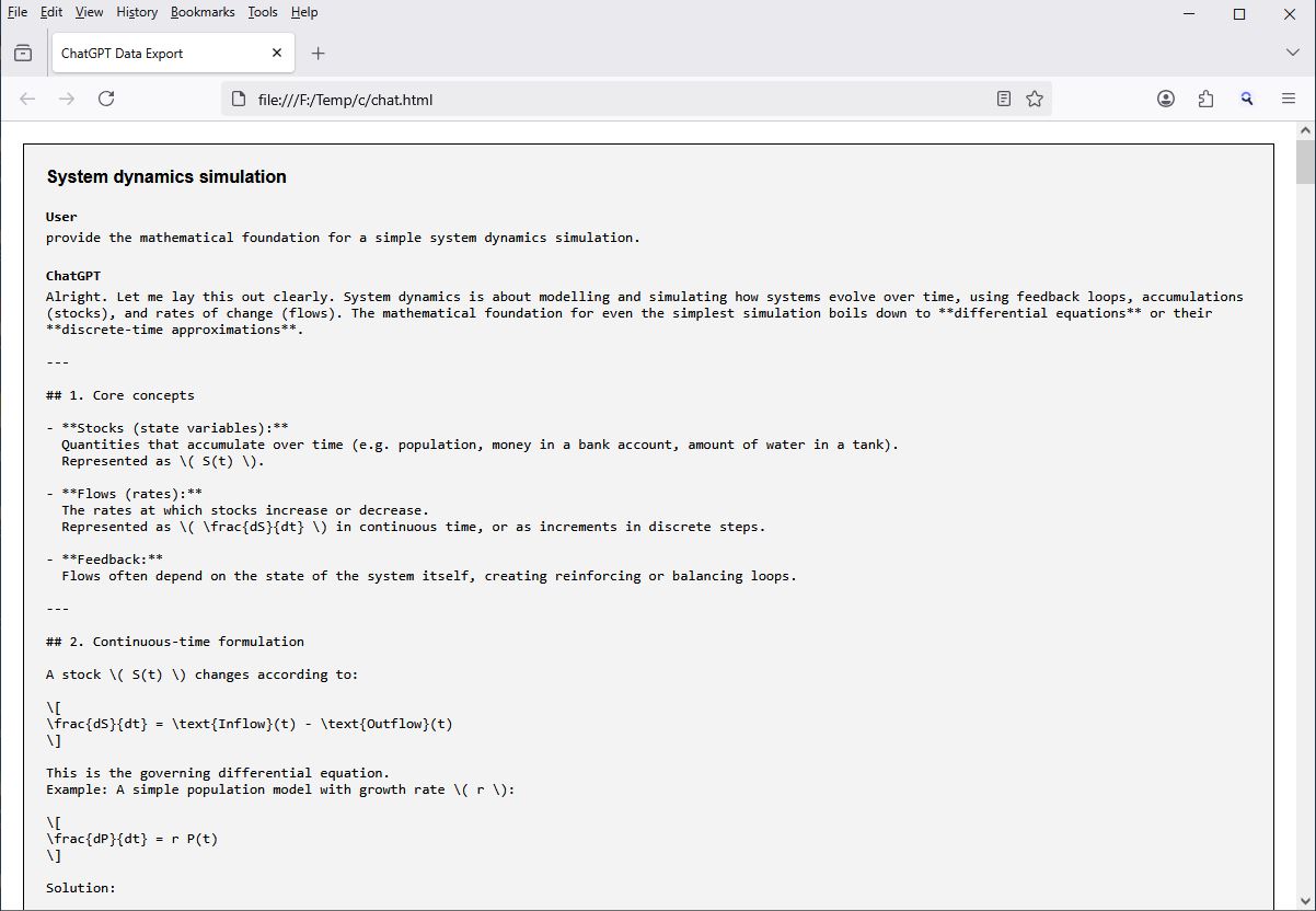 | Have you ever wanted to export your ChatGPT conversations for safekeeping, analysis, or simply to read them offline? The process itself is straightforward: you request your data from OpenAI and receive a ZIP file containing your entire conversation history (Figure 1). But what you find inside can be disappointing. Unpacking the archive reveals a collection of files, with a clunky HTML file that appears to be the only useful one. However, when opened in a browser, it displays as a monolithic wall of text (Figure 2). The formatting is lost, and mathematical equations are reduced to incomprehensible code—perhaps quite different from what one might have expected to see. At least, that was my initial response. |