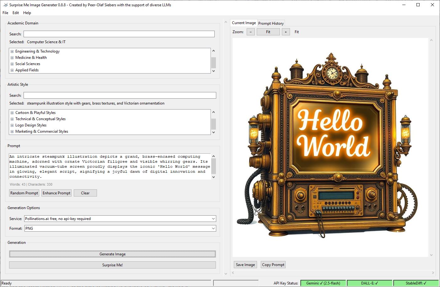 Ever stared at a blank canvas of AI image prompts, wondering what to create next? I have been there. That's why I am excited to share a tool that transforms the sometimes-daunting process of AI image generation into pure creative joy. Surprise Me Image Generator is a Python-based desktop application that bridges the gap between inspiration and creation. At its heart, it combines Google's Gemini AI for prompt generation with three popular image generation services: Pollinations.ai, DALL-E 3, and Stable Diffusion XL. What makes this tool special is its thoughtful approach to creative exploration. You can select from dozens of academic domains, from marine sciences to philosophy, and pair them with artistic styles ranging from watercolour paintings to glitch art. The application then generates contextually rich prompts that blend your chosen domain with stylistic direction, creating images you might never have thought to request. The interface is refreshingly straightforward. Left panel for controls, right panel for your generated masterpiece. Want to explore randomly? Hit "Surprise Me!" and watch as the tool selects a random domain and style, generates a prompt, and creates an image, all with one click. Prefer more control? Generate random prompts, enhance your own text, or manually craft everything yourself. | ||||||
