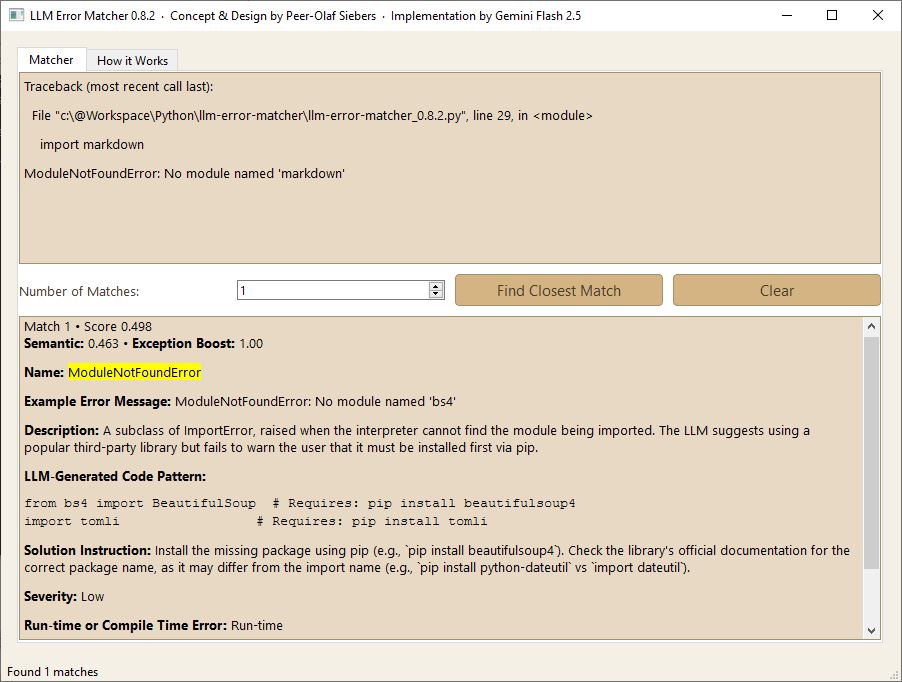 Under the hood, the tool uses a ranking system that compares your error message against its internal dataset. It applies a weighted combination of similarity metrics and boosts to find the closest match. The knowledge base is stored in a JSON file. Each error pattern is a JSON object, which makes it simple for you to add new error patterns or refine existing ones. If you do make improvements to your JSON file, it would be very valuable if you shared them. I will collect these contributions and update the zip file so that everyone benefits from a richer and more accurate set of error patterns. You can download the latest version of the application, llm-error-matcher_0.8.2.zip (last updated on 21/08/2025), together with the current JSON dataset, and try it out for yourself. |